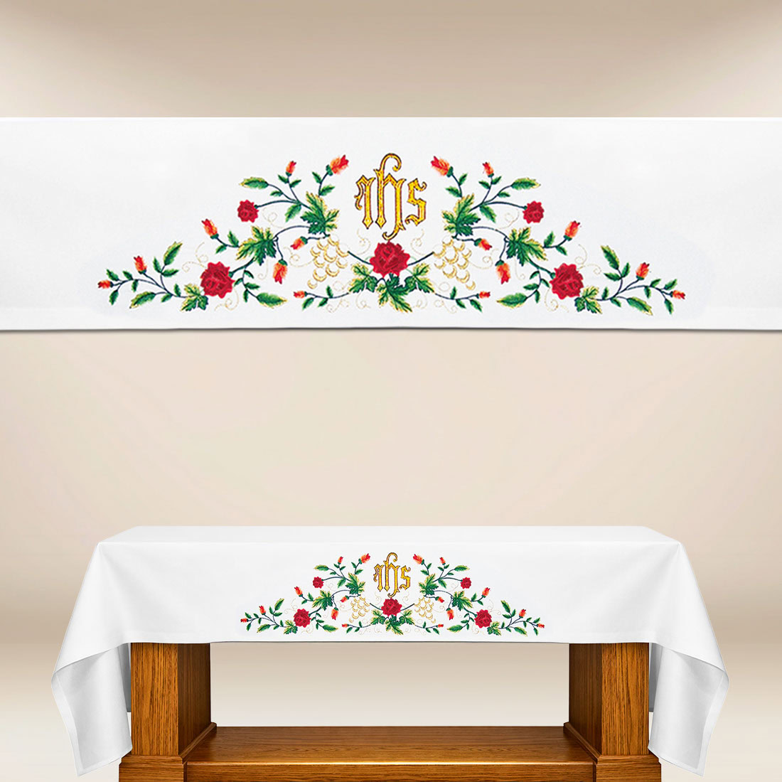 Il motivo centrale è un ricamo di 26 cm di altezza e 98 cm di lunghezza, che rappresenta la scritta IHS circondata da una composizione floreale nei toni del rosso e del bianco. Il ricamo è realizzato con grande attenzione ai dettagli, conferendo all’insieme un carattere raffinato e sacro. Gli ornamenti vegetali simboleggiano la vita, il rinnovamento e la purezza spirituale, rendendo la tovaglia perfettamente in armonia con l’arredamento del presbiterio.