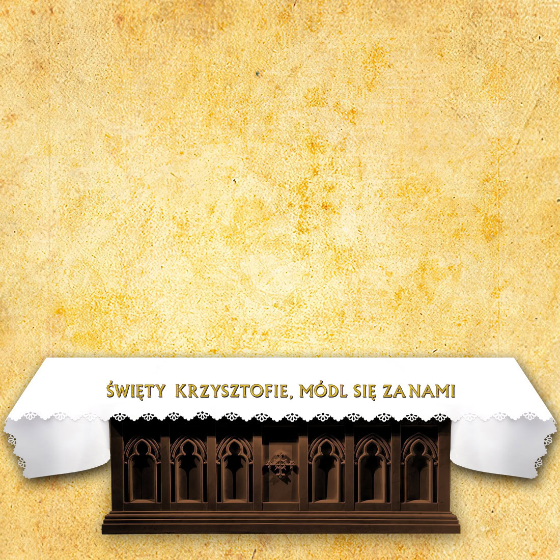 Tovaglia fotografica tagliata al laser “San Cristoforo, Prega Per Noi” è una decorazione liturgica rivolta in particolare a parrocchie e santuari dove San Cristoforo è venerato come patrono dei viaggiatori. La scritta realizzata con la tecnica della sublimazione – 130 cm di larghezza e 4,5 cm di altezza – è leggibile, durevole ed elegantemente simile a un ricamo, costituendo così una parte armoniosa dell’arredo dell’altare. Il contenuto della invocazione di preghiera introduce i fedeli in un’atmosfera di fiducia nella protezione della Trinità attraverso l’intercessione del santo.