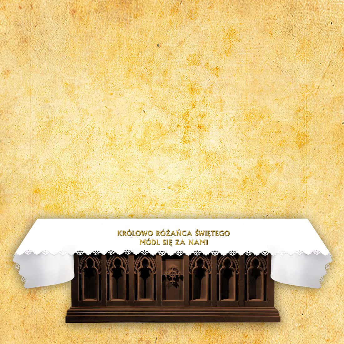 Tovaglia d’altare traforata con la scritta “Regina del Rosario, prega per noi” è un’eccezionale decorazione mariana che sottolinea in modo particolare la dimensione spirituale delle celebrazioni del rosario. La scritta, realizzata con una tecnica di sublimazione, imita il ricamo, rimanendo durevole, chiara ed estetica. Tale invocazione di preghiera introduce nella spazio del tempio un’atmosfera di affidamento e concentrazione orante.