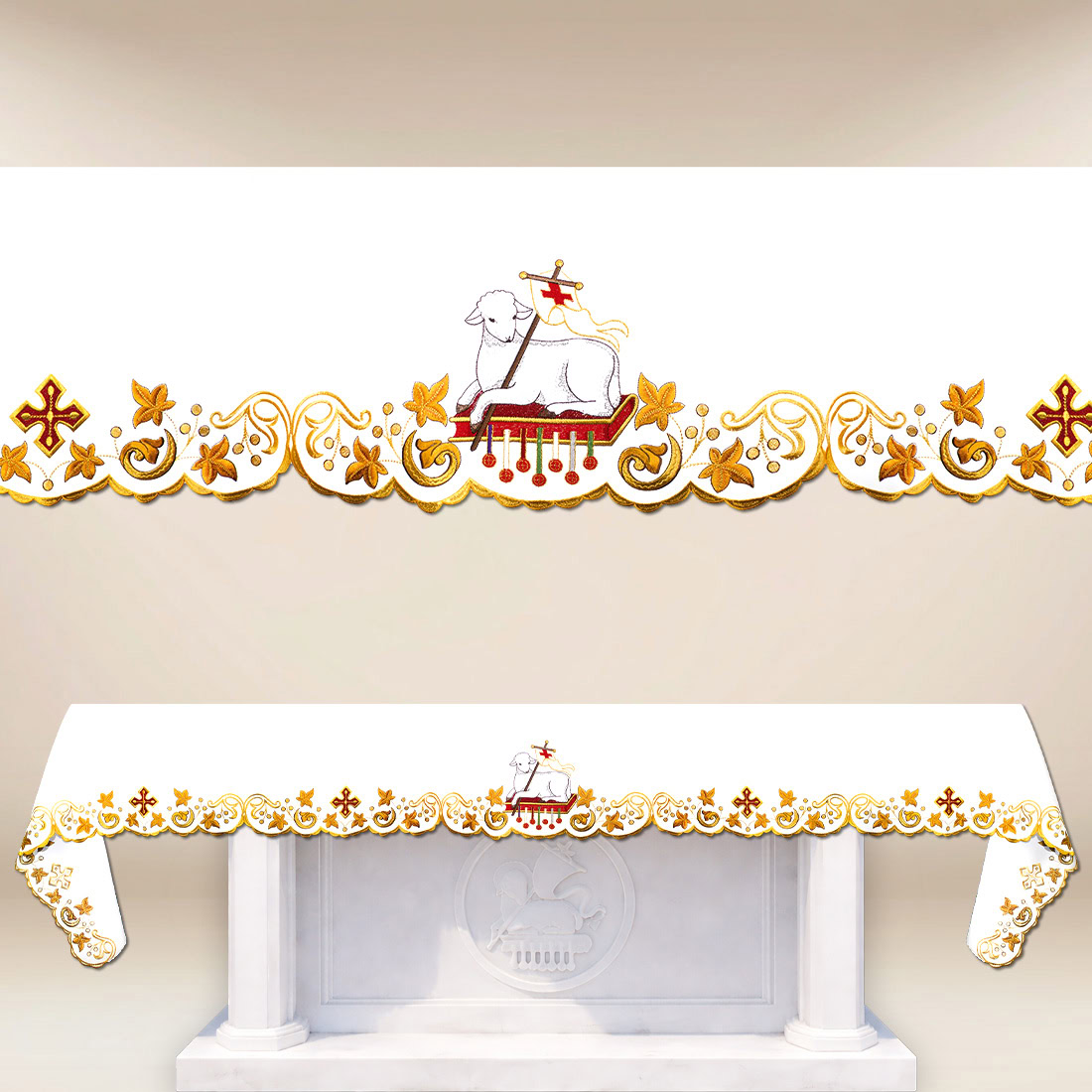 Tovaglia ricamata liturgica “Agnello di Dio” è un elegante e durevole copertura per l’altare, che unisce l’estetica sacra con la funzionalità pratica. Realizzata in tessuto poliestere antimacchia, è facile da mantenere pulita e conserva il suo aspetto impeccabile per molte stagioni liturgiche. L’altezza del ricamo è di 22 cm, il che rende l’immagine ben definita e sottolinea adeguatamente il posto centrale dell’altare. La tovaglia è disponibile fino a 650 cm di lunghezza, rendendola perfetta sia per grandi templi che per cappelle.