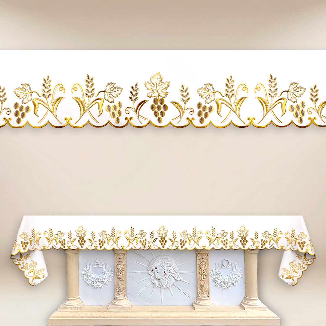 Tovaglia per altare ricamata “Alfa D’Oro” è un proposta ispirata ai simboli sacri che da secoli accompagnano l’Eucaristia. Il motivo ricamato di altezza 17 cm rappresenta grappoli d’uva e spighe di grano — motivi che uniscono la dimensione teologica del pane e del vino. Il ricamo, realizzato con grande precisione, costituisce un chiaro segno liturgico che si armonizza splendidamente con lo spazio del presbiterio e sottolinea la solennità della celebrazione.