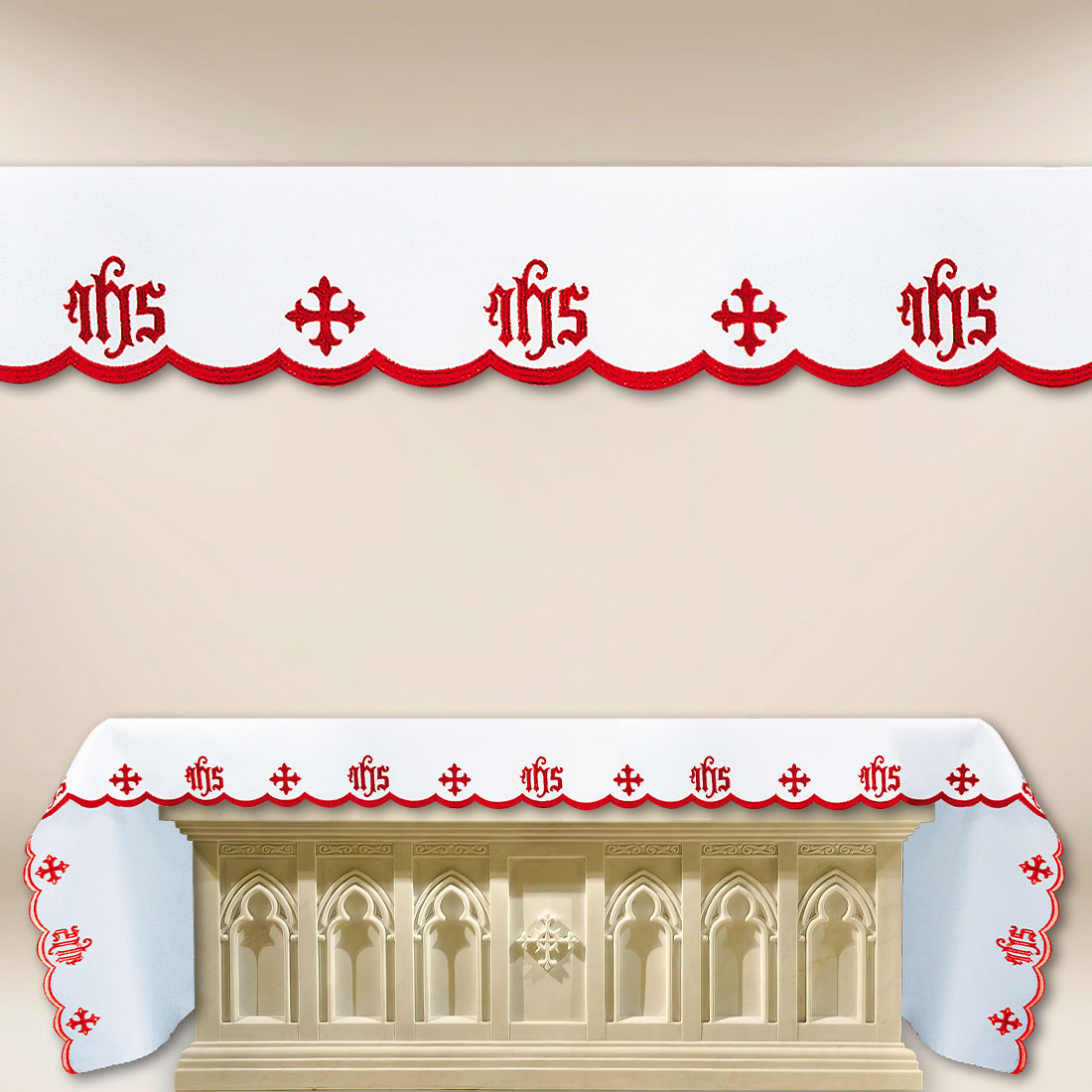 Tovaglia per altare ricamata “Cattedrale” Rossa – su misura è una decorazione classica del presbiterio, caratterizzata dalla combinazione di alta estetica e chiara simbolica eucaristica. Il motivo IHS e le croci inserite in una linea elegante di ricamo sottolineano il significato della liturgia e creano un’atmosfera di preghiera e concentrazione.