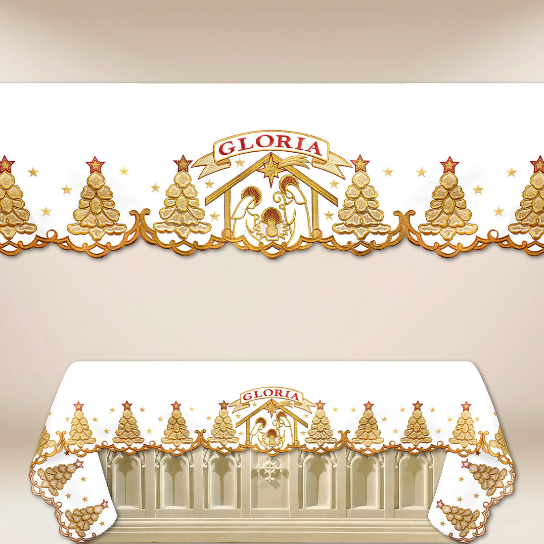 La simbologia contenuta nel ricamo “Gloria” si riferisce ai testi liturgici, rendendo omaggio alla gloria divina. L’ornamento sottolinea la solennità della celebrazione, specialmente durante il periodo festivo, quando la bellezza dell’altare assume un significato particolare nell’esperienza dell’Eucaristia. La lavorazione precisa e il bordo traforato conferiscono leggerezza alla composizione, mantenendo al contempo la piena gravità della forma.