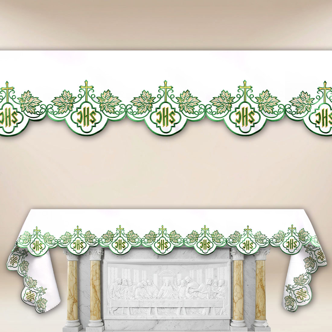Tovaglia per altare ricamata „IHS Verde” è stata progettata pensando alla liturgia, che richiede sia estetica che soluzioni funzionali. Il ricamo di 15 cm di altezza posizionato sulla parte anteriore della tovaglia presenta il motivo IHS circondato da decorazioni ornamentali. Questa composizione richiama la tradizionale simbologia eucaristica, creando un accento sacro e coerente nel presbiterio.