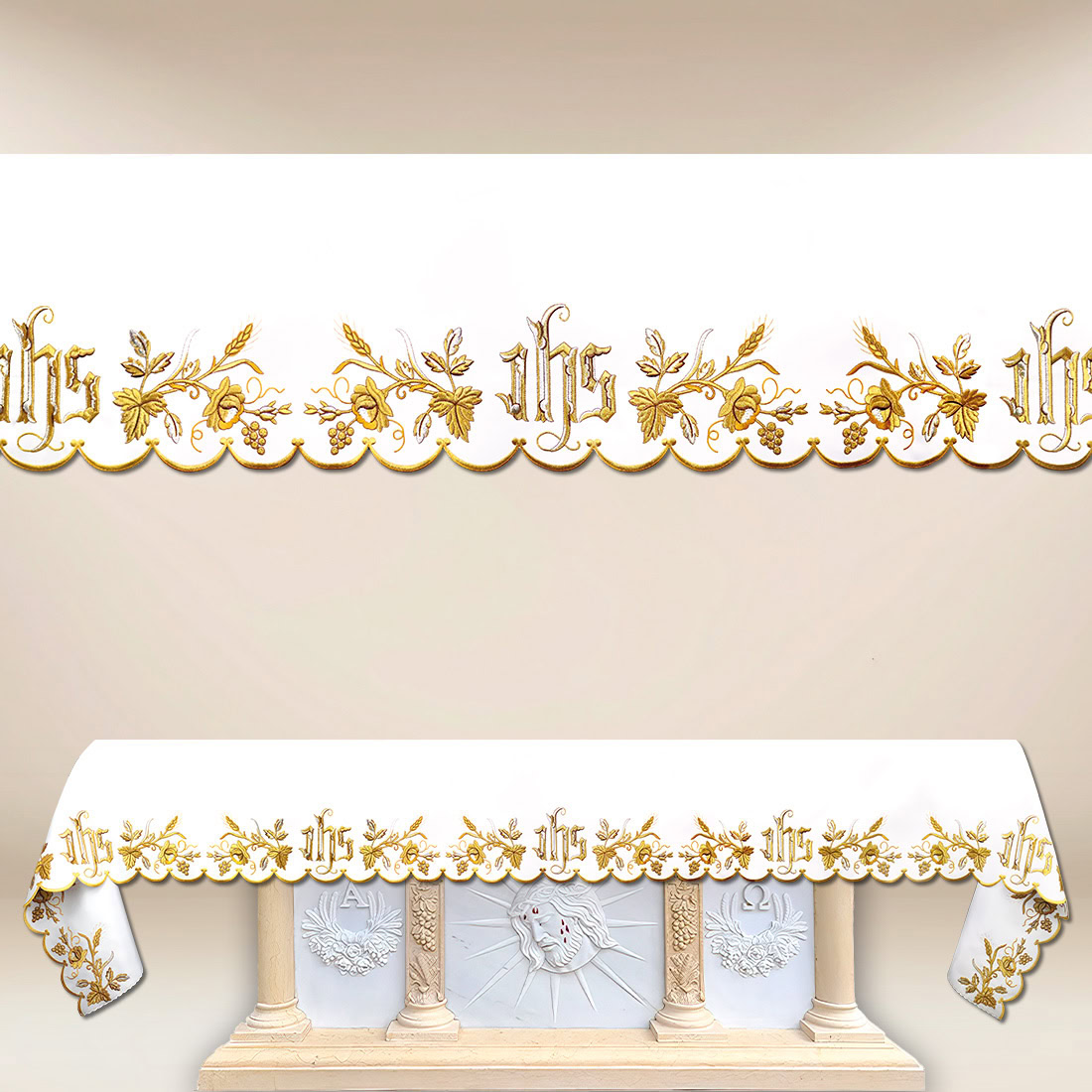 Tovaglia ricamata con un bellissimo ricamo dorato IHS, è un elegante completamento tessile dell’altare che unisce eleganza, serietà liturgica e profonda simbolicità dell’Eucaristia. Il motivo IHS, sviluppato in proporzioni armoniose e in una forma classica e leggibile, sottolinea l’importanza centrale del luogo di celebrazione, mentre i delicati accenti dorati conferiscono alla tovaglia un aspetto particolarmente nobile. L’intero progetto è stato concepito per unire il carattere tradizionale a un’estetica sottile, senza eccessi e senza decorazioni superflue.