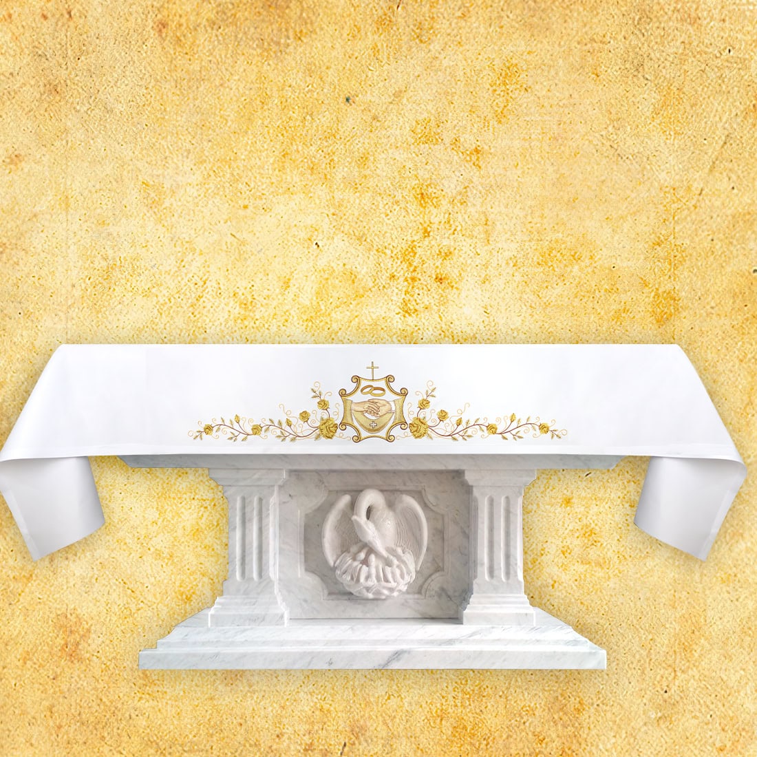 Questo modello è una proposta per le parrocchie che desiderano sottolineare il carattere solenne della celebrazione del sacramento del matrimonio attraverso la scelta di tessuti di alta estetica e durabilità. Grazie alla sua ornamentazione unica e al tessuto resistente alle macchie, tovaglia da altare per matrimoni ricamata diventa non solo una decorazione, ma anche un elemento pratico e durevole dell’arredamento del tempio.