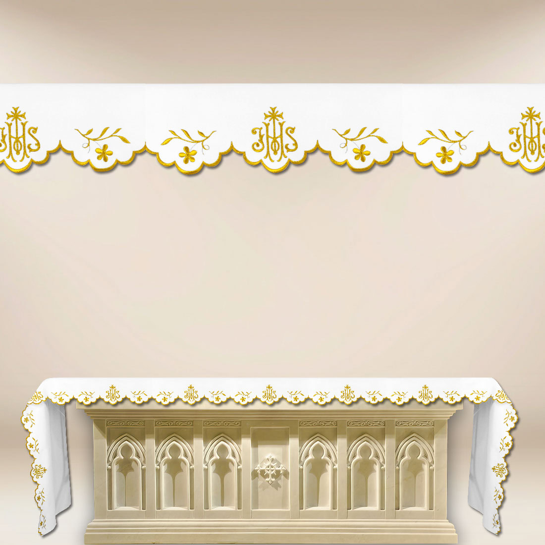 La struttura della tovaglia è stabile, liscia e finemente rifinita, permettendo al materiale di posarsi uniformemente sulla superficie dell’altare. Il ricamo stesso è realizzato con alta precisione, garantendo leggibilità, durabilità e resistenza all’uso frequente. La delicata conduzione dei fili consente di ottenere un effetto visibile ma non dominante: la decorazione arricchisce il presbiterio senza distogliere l’attenzione dal centro della liturgia. La tovaglia con delicati ricami dorati si adatta sia alle celebrazioni solenni che al servizio quotidiano, mantenendo un aspetto estetico nel tempo.