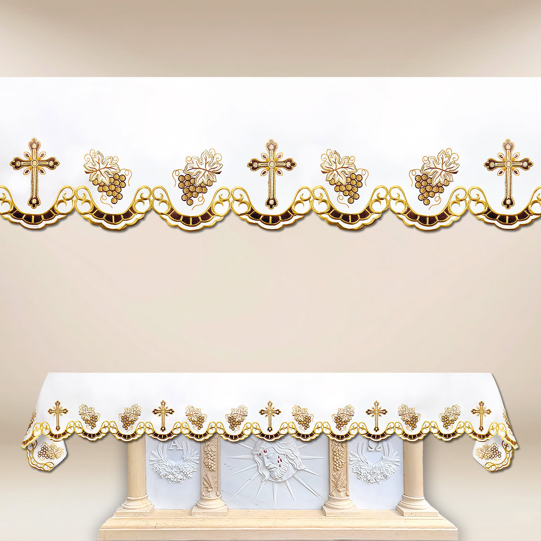 Elegante tovaglia per altare ricamata “Uva Dorata” costituisce un’eccezionale decorazione liturgica che conferisce al presbiterio un carattere solenne.