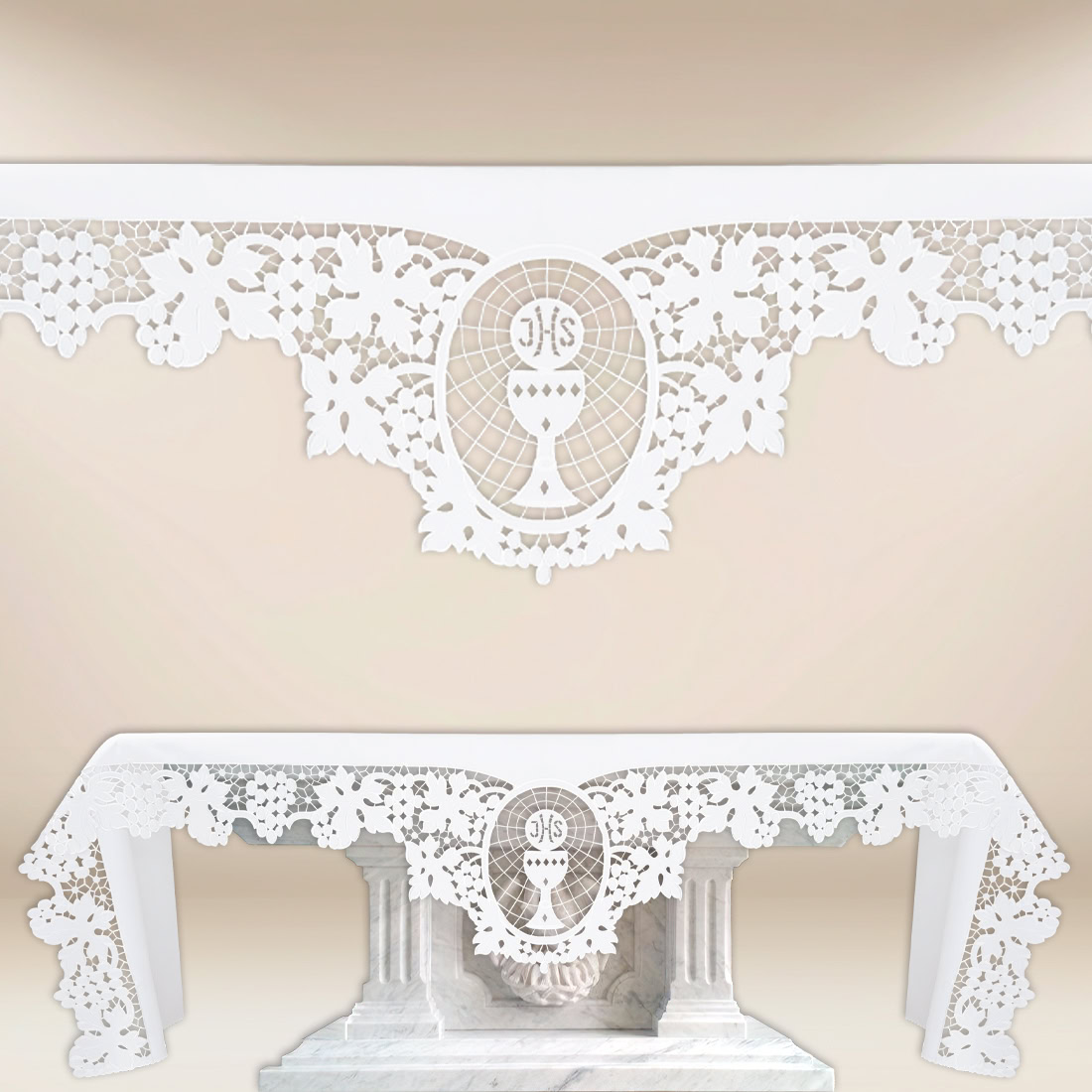 Il runner è disponibile in lunghezze fino a 650 cm, il che consente di adattarlo agli altari delle chiese parrocchiali, santuari, monasteri e cappelle. La sua forma traforata crea una linea decorativa sottile, che mette in risalto il posto centrale del presbiterio. L’uso del motivo eucaristico rimanda simbolicamente al sacramento che rappresenta il cuore della liturgia — per questo motivo il runner si adatta particolarmente bene durante le celebrazioni della Prima Comunione, l’adorazione del Santissimo Sacramento, le festività ecclesiali e le celebrazioni di carattere speciale.
