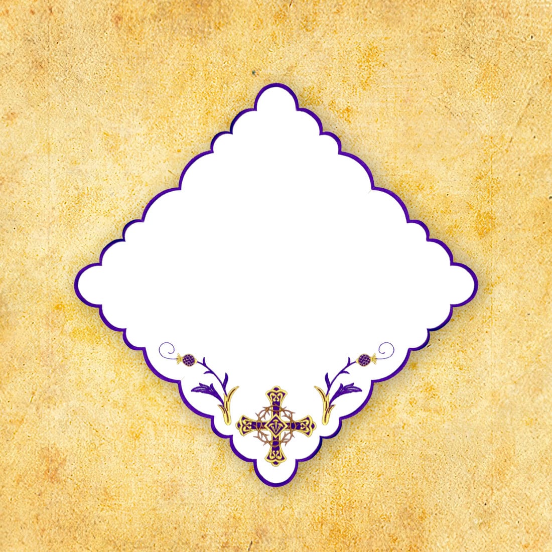 Tovaglietta ricamata quaresimale 32×32 del set “Corona di Spine” è un’eccezionale proposta di biancheria d’altare destinata alla celebrazione della liturgia della Quaresima. La sua composizione richiama la Passione del Signore – il motivo della croce circondata da una corona di spine ricorda la riflessione spirituale e la preparazione per le Festività Pasquali. Le delicate decorazioni oro-viola creano un insieme elegante e coerente, inserendosi nella simbologia del periodo di penitenza.