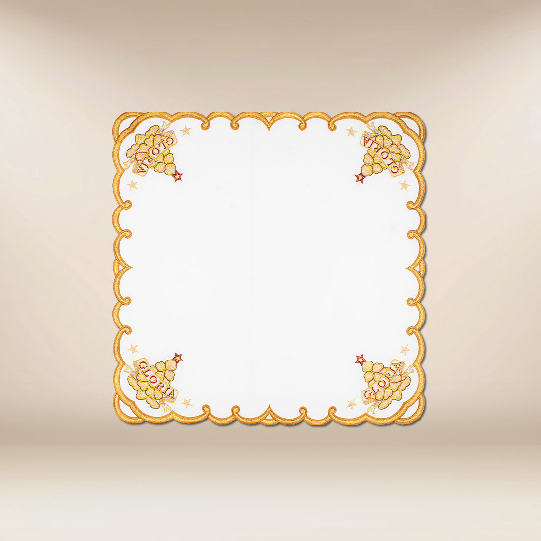 Tovaglietta ricamata liturgica „Gloria” 45×45 è un’eccezionale proposta del set omonimo, creata per sottolineare la bellezza festiva dello spazio sacro. Le sue decorazioni intagliate e i delicati ricami „Gloria” nei quattro angoli formano una composizione armoniosa, che si inserisce perfettamente nell’atmosfera del Natale e delle celebrazioni solenni. Questa tovaglietta ricamata liturgica porta leggerezza, eleganza e profondità simbolica all’allestimento dell’altare.