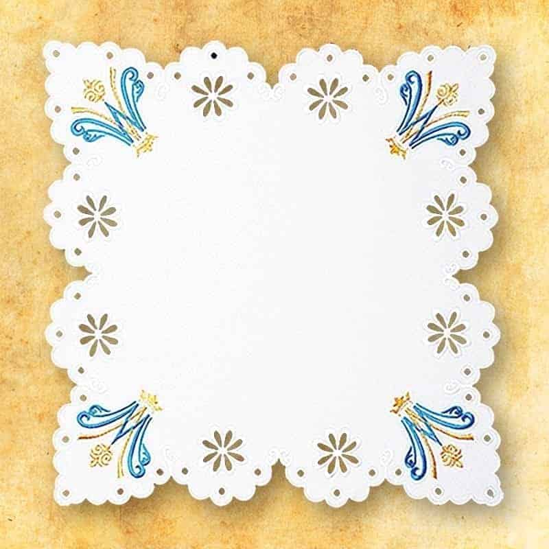 La tovaglietta è decorata con ricamo dorato Mariano, ispirato a motivi mariani classici presenti nell’arte sacra.