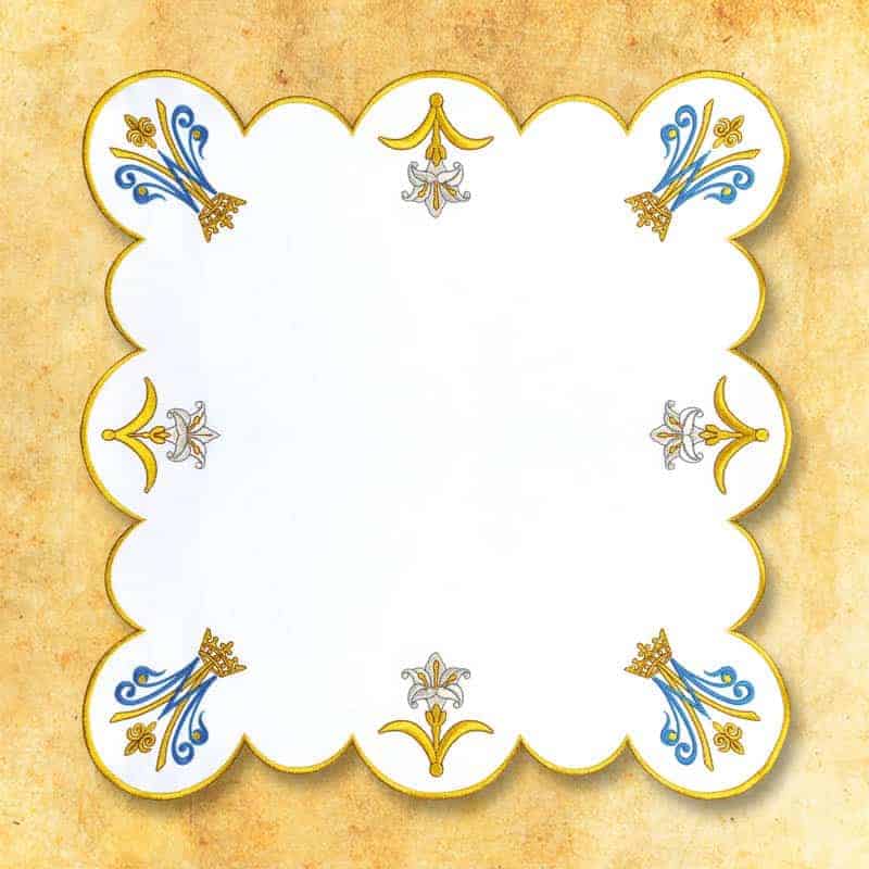 La tovaglietta è decorata con ricamo dorato Mariano, ispirato a motivi mariani classici presenti nell’arte sacra.