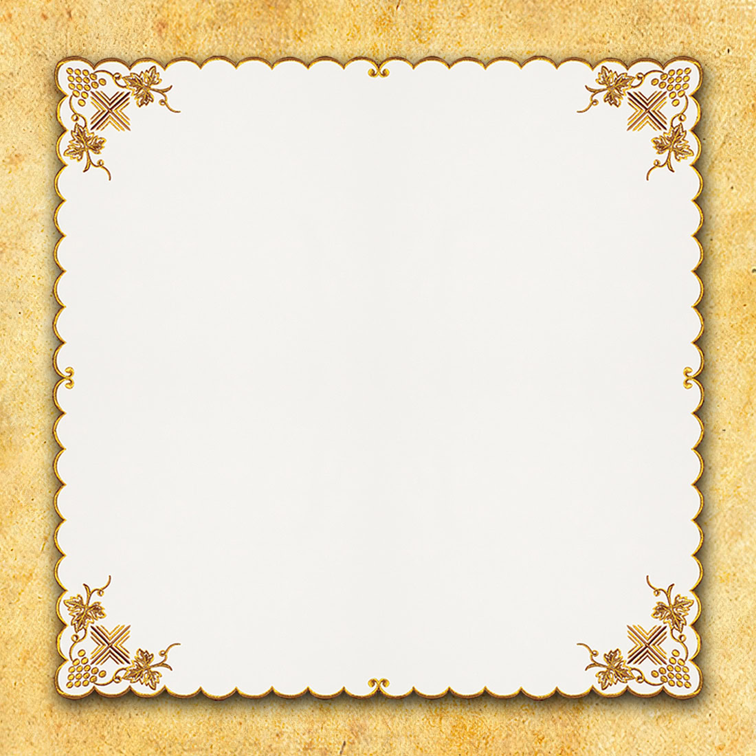 La tovaglietta si adatta come decorazione per l’altare, la cappella, la sacrestia, vicino alle statue dei santi e nei reliquiari. La sua classica colorazione – ricamo oro e bronzo su uno sfondo neutro – si armonizza perfettamente con ogni arredamento ecclesiastico, sia tradizionale che moderno. Il prodotto è realizzato in tessuto di alta qualità, resistente alle pieghe e ai lavaggi frequenti, garantendo un uso prolungato senza perdita di estetica.