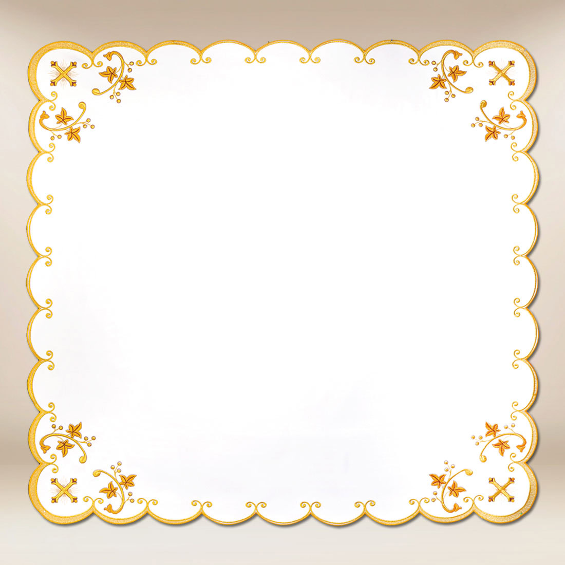 La tovaglietta ricamata “Serie Oro Calice” di dimensioni 110cm x 110cm si adatta perfettamente come copertura per l’altare laterale, tavolo in sacrestia o elemento decorativo in cappella. È una scelta ideale per le parrocchie che desiderano unire tradizione, eleganza e alta qualità di esecuzione in ogni dettaglio dell’arredo liturgico.