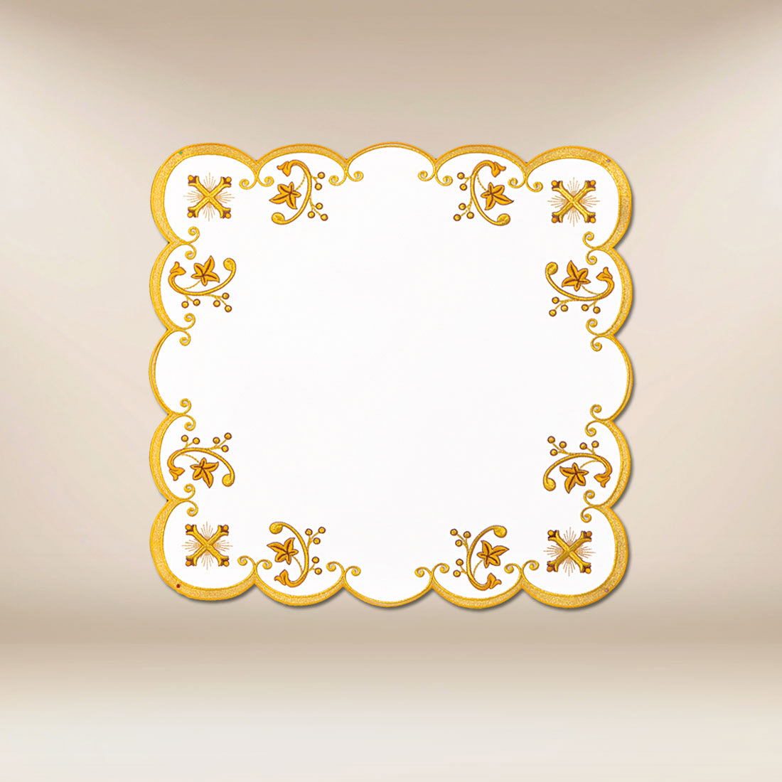 Tovaglietta liturgica 45cm x 45cm “Serie Oro Calice” realizzata in tessuto poliestere bianco di alta qualità (100%).