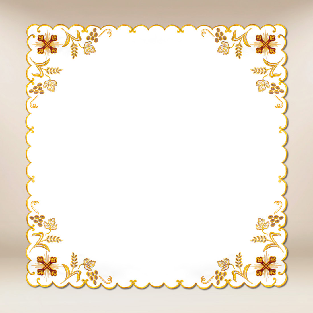 Tovagliolo ricamato „Alfa D’Oro” 95×95 è destinato agli altari maggiori e laterali, come decorazione autonoma o elemento di un insieme coerente di tessuti ecclesiastici. È una proposta per le parrocchie che apprezzano una simbolica chiara, eleganza e qualità duratura. Urbanowicz Haft Polska – tradizione e artigianato, in cui il sacro e la bellezza si incontrano in ogni filo.