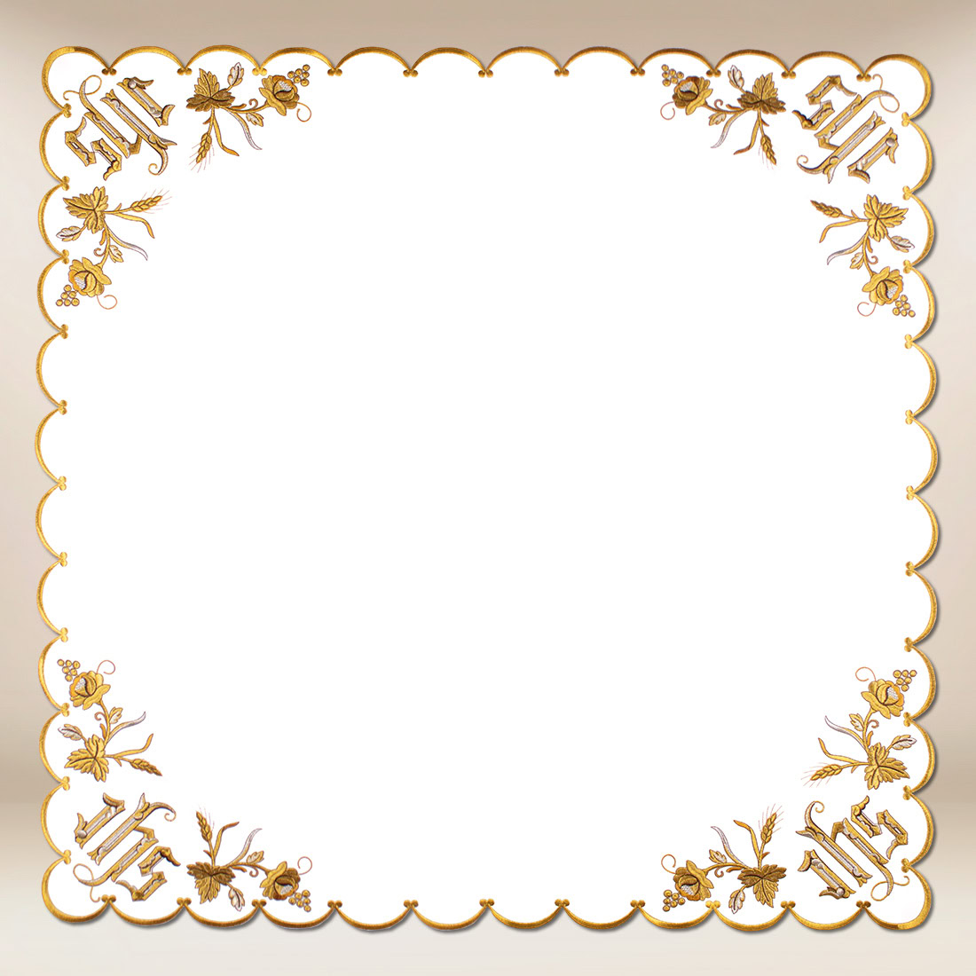 Tovagliolo ricamato di dimensioni 110cm× 110cm con motivo IHS è un elegante elemento di decorazione dell’altare, che unisce sottigliezza, simbolismo e significato spirituale. Realizzato in tessuto poliestere bianco di alta qualità, mantiene un aspetto ideale anche dopo numerosi lavaggi. Il delicato ricamo dorato, posizionato attorno ai bordi e centralmente con il simbolo IHS, conferisce al tovagliolo un carattere unico, sottolineando l’atmosfera solenne della liturgia e la presenza dell’Eucaristia.