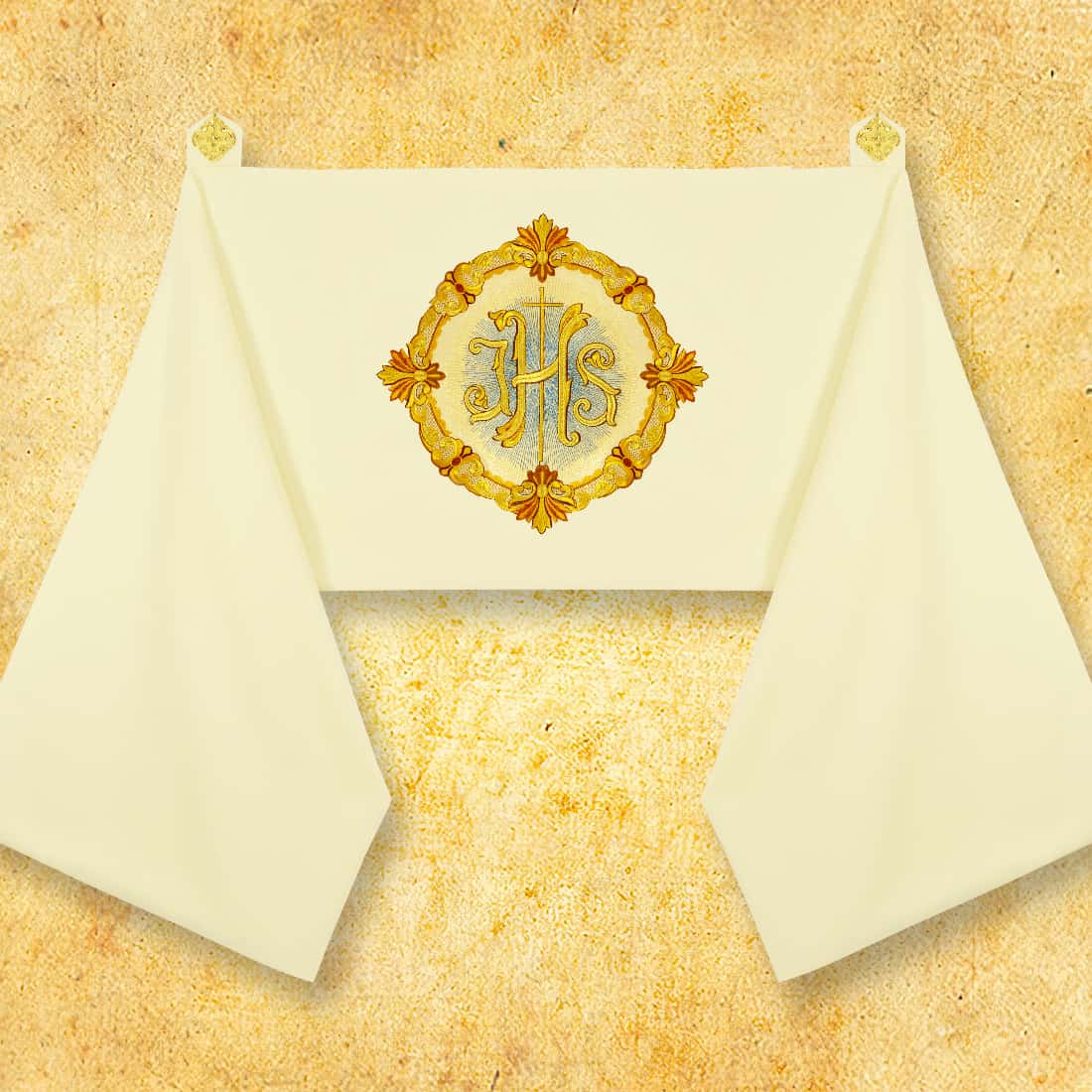 Velo omerale ricamato con IHS Feliz Navidad è un elemento unico delle vesti liturgiche, destinato all’adorazione e alla benedizione con il Santissimo Sacramento. Realizzato in tessuto liturgico di alta qualità color ecru, incanta per il suo delicato lucido e per il ricamo accuratamente elaborato che rappresenta il monogramma IHS in una cornice decorativa dorata. La composizione dei motivi unisce la tradizione della simbologia cristologica all’eleganza della forma, conferendo al velo un carattere solenne e festoso.