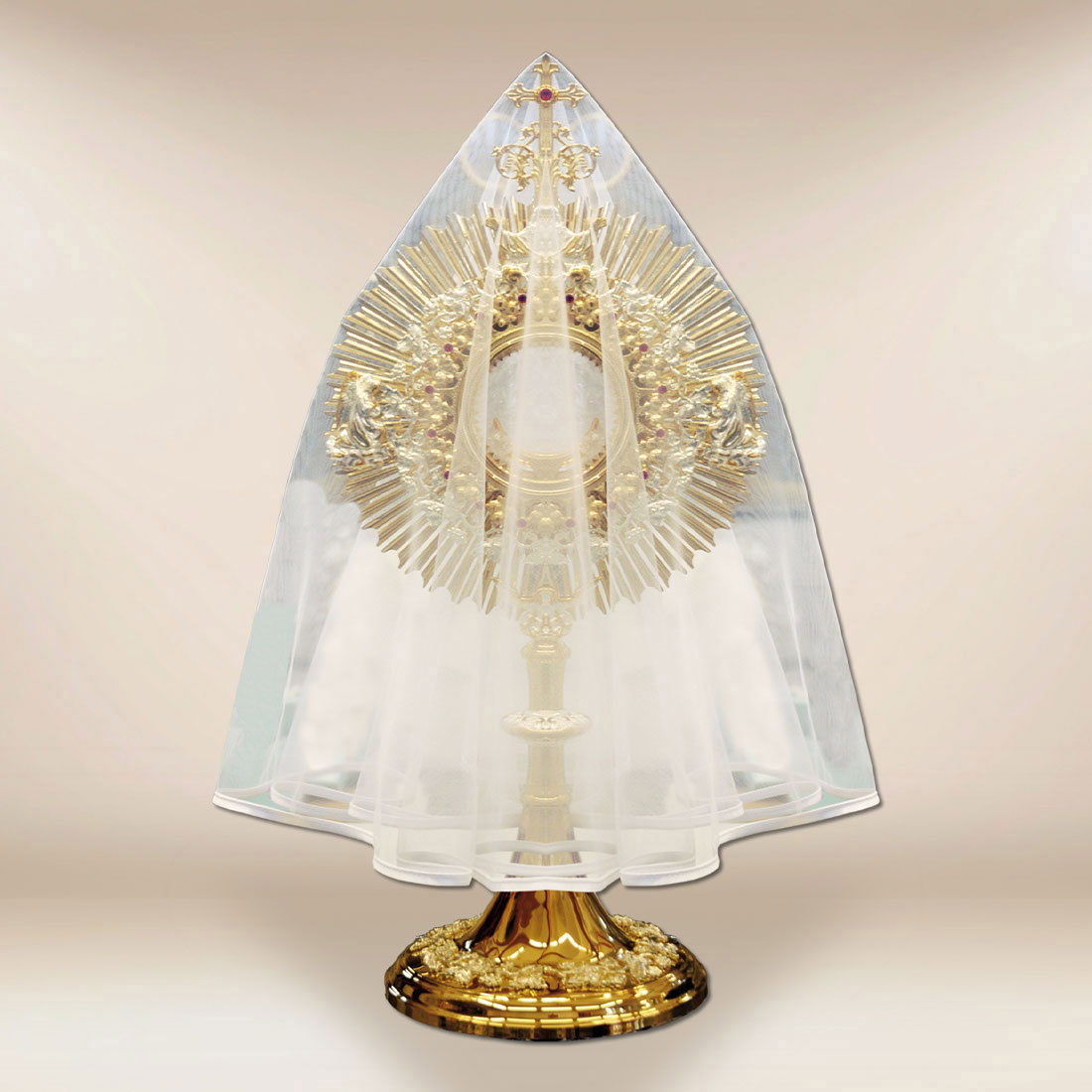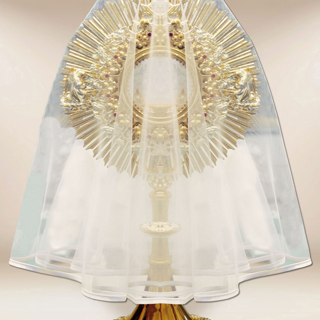 Il taglio delicato e leggermente cadente consente al velo di adattarsi dolcemente attorno alla monstranza, conferendo all’intera composizione coerenza e chiarezza liturgica.