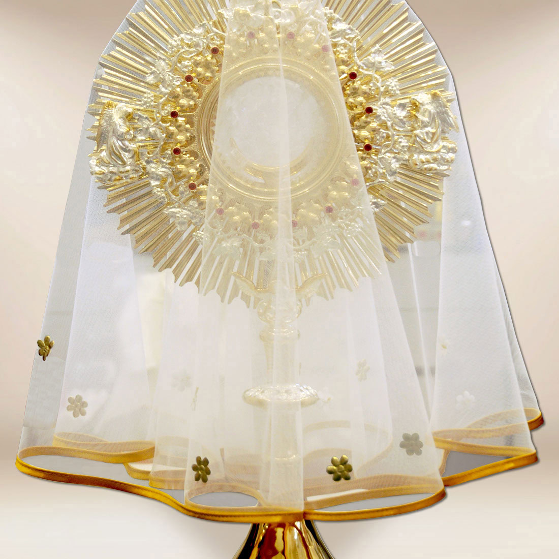 Il materiale trasparente avvolge la monstranza con un leggero e luminoso drappeggio, sottolineando la sua bellezza e il suo carattere sacro.