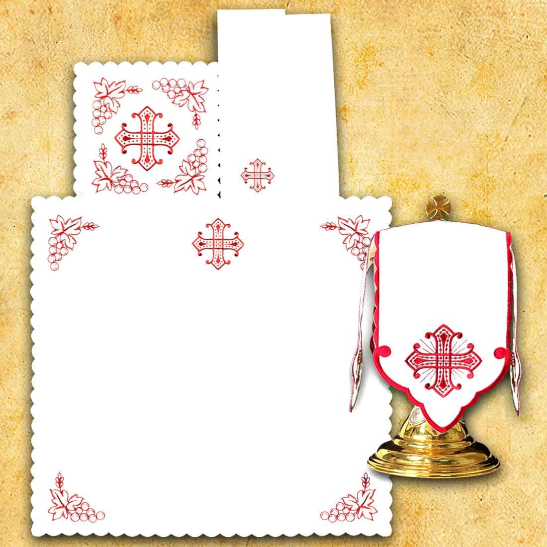 Palki haftowane, korporały haftowane i sukienki na puszkę wykonano z białej plamoodpornej tkaniny obrusowej.