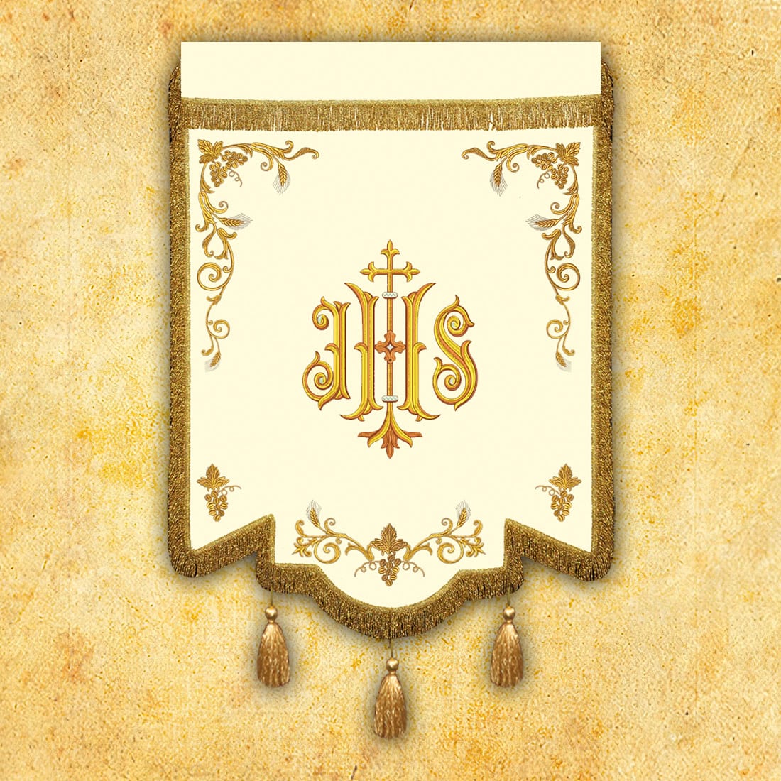 Chorągwie haftowane dwustronne wykonane na tkaninie żakard (przód chorągwi ecru, tył czerwony lub ecru), całość obszyta złotymi frędzlami i doczepianymi złotymi chwostami.