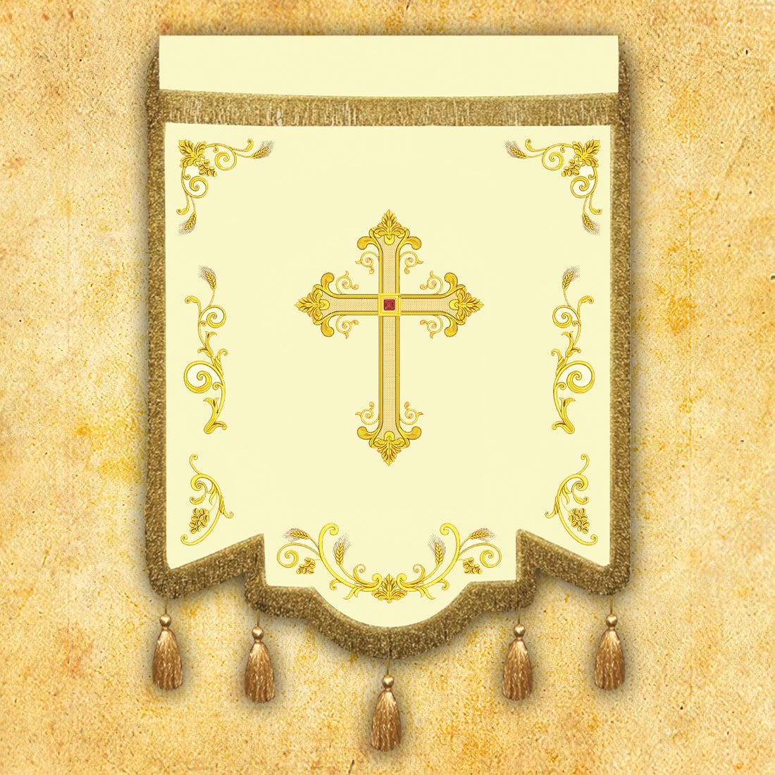 Chorągwie haftowane z wizerunkiem fotograficznym, całość obszyta złotymi frędzlami.