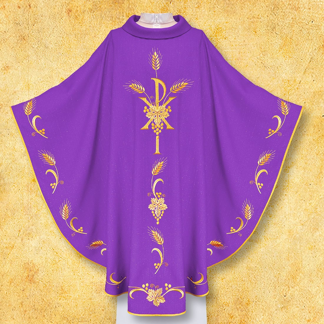 Ekskluzywny ornat liturgiczny z haftowanym motywem PX (Chrystogram), wykonany z najwyższej jakości tkaniny SACROLINE w kolorze fioletowym, subtelnie przeplatanej złotą nicią.