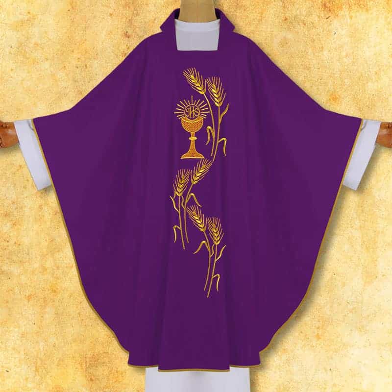 Elegancki haftowany ornat liturgiczny wykonany z wysokiej jakości tkaniny „Tropic Włoski”, charakteryzującej się lekkością, miękkością i doskonałą trwałością.