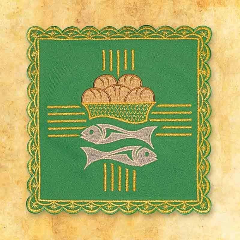 Zdobienie przedstawia ryby i kosz z chlebami – motyw nawiązujący do cudu rozmnożenia chleba opisany w Ewangelii. To symbol obfitości, Bożej łaski oraz duchowego pokarmu, którym jest Eucharystia. Delikatne połączenie złotych i srebrnych nici tworzy harmonijny haft o wyjątkowej głębi i subtelnym blasku.