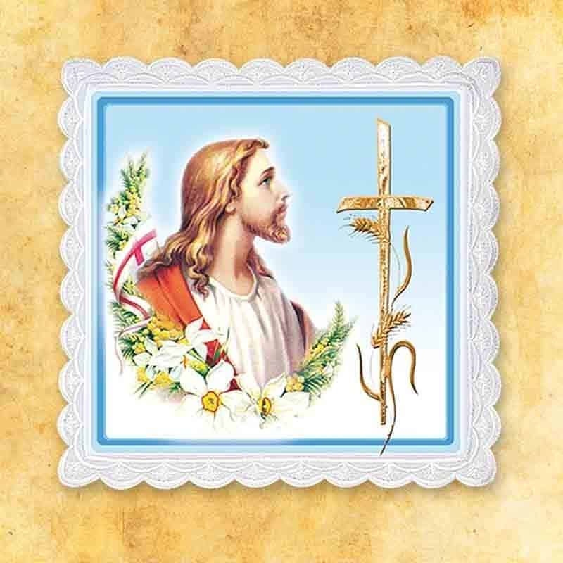 Palka foto nr 37 to wyjątkowy element bielizny kielichowej, który łączy w sobie piękno sakralnej symboliki i nowoczesną technikę wykonania. Przedstawia wizerunek Jezusa Chrystusa w otoczeniu kwiatów i krzyża – symbolu Zmartwychwstania, zwycięstwa życia nad śmiercią i odkupienia świata. Subtelne połączenie błękitnego tła z ciepłymi barwami postaci nadaje całości wyjątkowej głębi i duchowego wymiaru.
