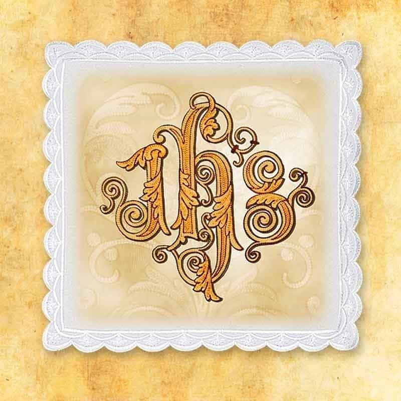 Palka foto nr 34 to elegancki element bielizny kielichowej, ozdobiony klasycznym monogramem IHS, będącym jednym z najstarszych chrystogramów symbolizujących imię Jezusa Chrystusa. Zdobienie w odcieniach złota i brązu nadaje pallce wyjątkowego blasku, łącząc tradycję z ponadczasową estetyką liturgiczną. Subtelne tło z ornamentem roślinnym podkreśla duchowy wymiar kompozycji, czyniąc z niej piękny akcent każdej celebracji Eucharystycznej.
