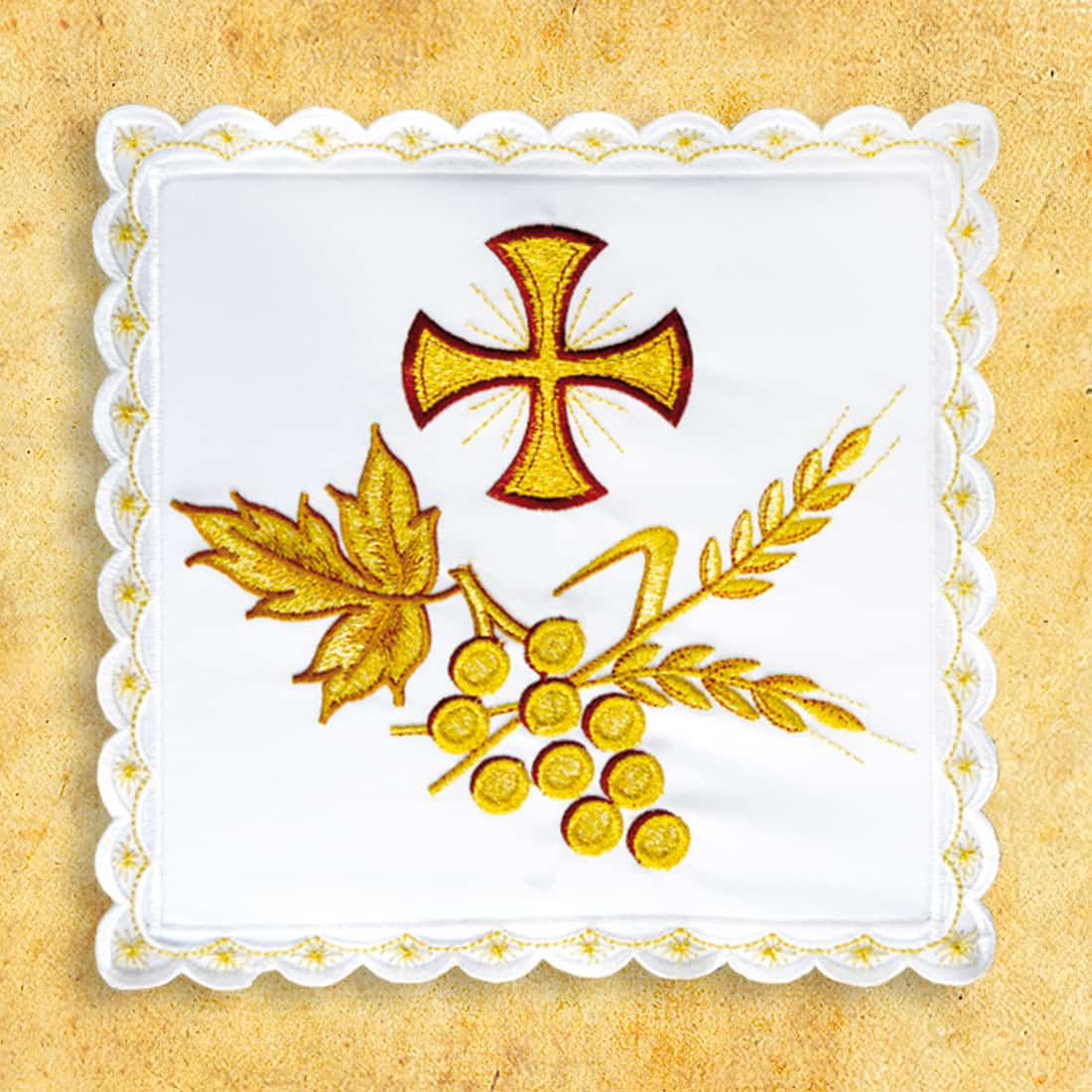 Palka haftowana biała nr 35 to elegancki i symboliczny element bielizny kielichowej, wykonany z wysokiej jakości białej tkaniny liturgicznej. Zdobiona misternym haftem przedstawiającym złoty krzyż, kłosy zboża i winne grona, stanowi wyjątkowy symbol Eucharystii – Ciała i Krwi Chrystusa.
