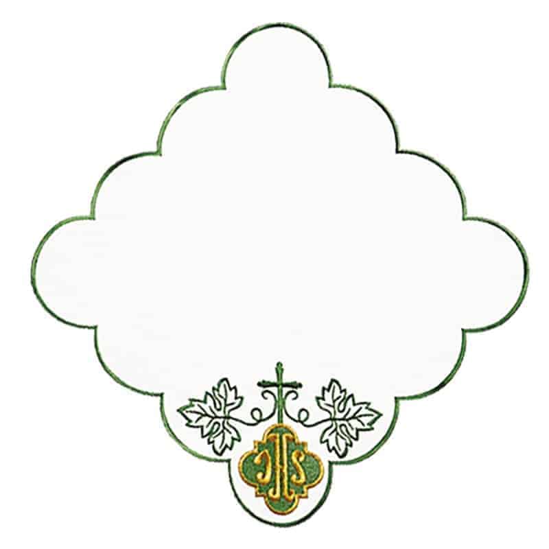 Serdecznie polecamy Państwu gustowny i elegancki produkt w postaci liturgicznej serwetki haftowanej z kompletu IHS Zielony o wymiarze 32×32 cm.