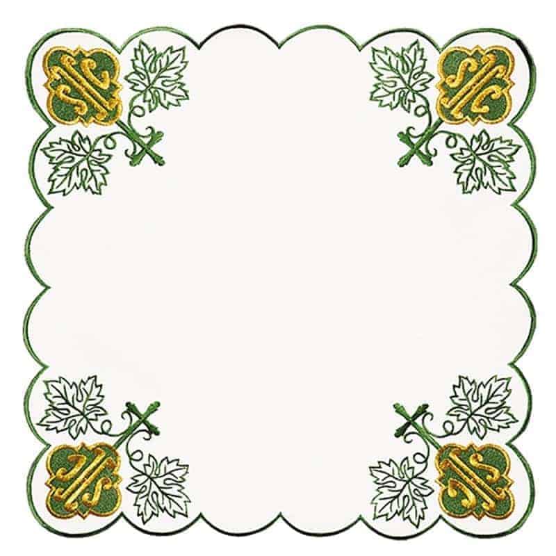Serdecznie polecamy Państwu gustowny i elegancki produkt w postaci liturgicznej serwetki haftowanej z kompletu IHS Zielony o wymiarze 45×45 cm.