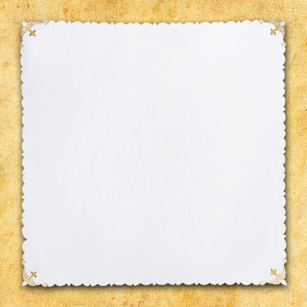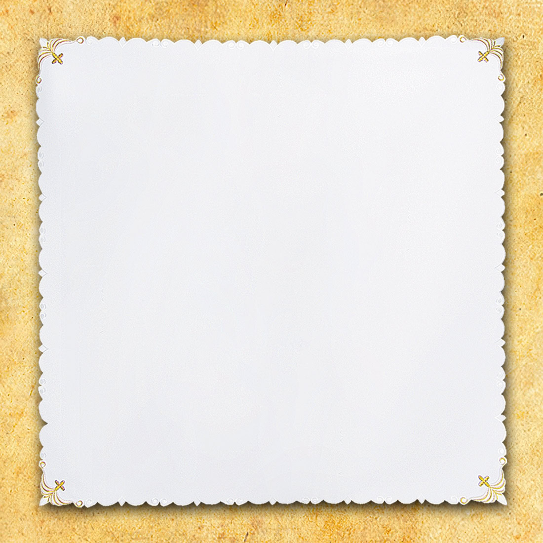 Serwetka liturgiczna 95cm x 95cm wykonana z wysokiej jakości białej tkaniny poliestrowej , gładkiej i plamoodpornej.