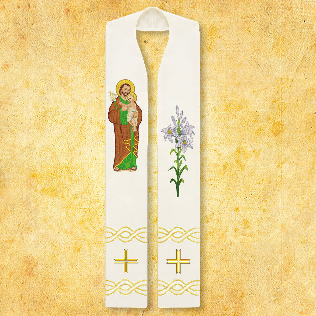 Haftowana stuła wykonana z wysokiej jakości tkaniny będącej mieszanką trwałych włókien. Zdobiona precyzyjnym haftem przedstawiającym św. Józefa trzymającego Dzieciątko Jezus.