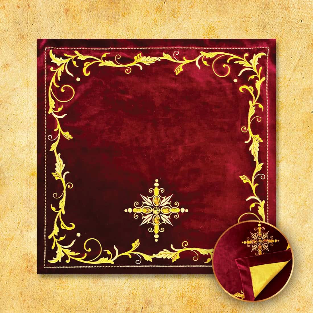 Ekskluzywny welon na kielich w kolorze bordo o wymiarach 55 × 55 cm stanowi elegancki i uniwersalny dodatek do liturgicznego wyposażenia ołtarza.